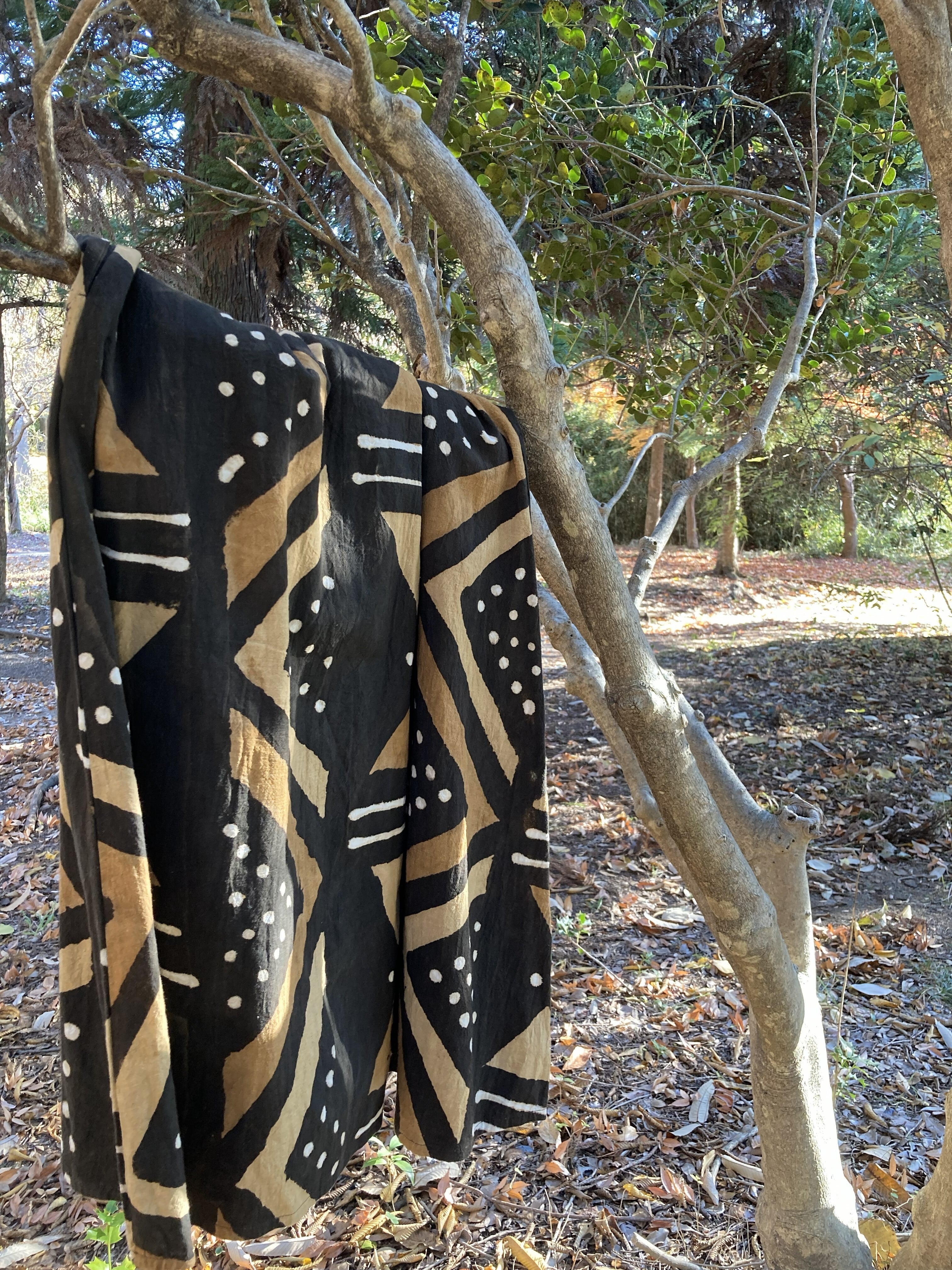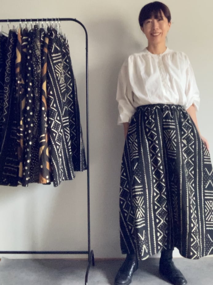 当店のスカートは、西アフリカ・マリ共和国の泥染布「ボゴランフィニ」で仕立てています。